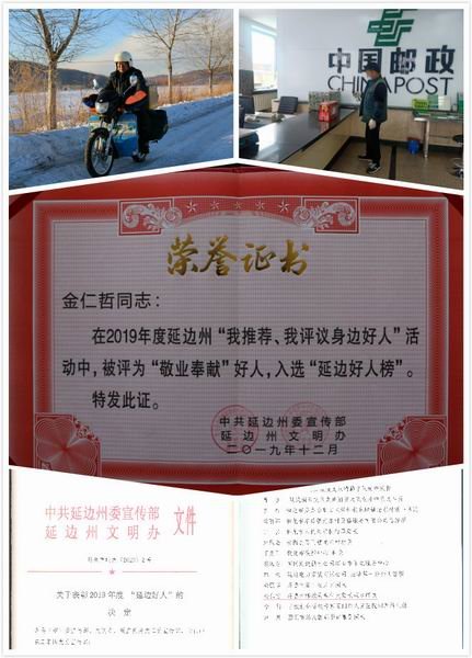近日,中共延邊州委宣傳部和延邊州文明辦公布2019年度“延邊好人”評選結(jié)果,琿春市分公司春化支局鄉(xiāng)郵員金仁哲榮列其中。