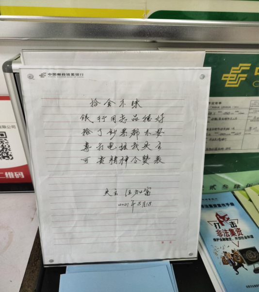 一個(gè)小時(shí)后,終于發(fā)現(xiàn)原來是官港鎮(zhèn)民主村70多歲的村民汪加福在ATM機(jī)自助取款時(shí)不小心遺失的,在確認(rèn)失主后,胡局長多方打聽,終于和汪加福老人取得了聯(lián)系,通知老人第二天到營業(yè)大廳領(lǐng)取失款。 第二天,汪加福老人來到官港郵政支局,和胡局長說,你們郵政員工的品德太高尚了,這讓他非常感動(dòng),為了表達(dá)謝意,他當(dāng)天晚上醞釀半宿,寫了一首打油詩送給胡局長,贊揚(yáng)郵政員工風(fēng)格高品德好,更是贊嘆百年郵政確實(shí)值得百姓信賴,回去一定要好好宣傳郵政,今后有錢都到郵政存。