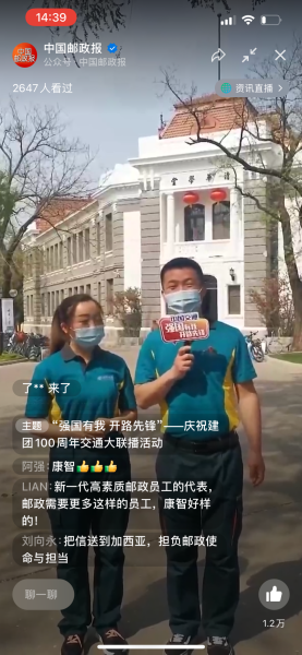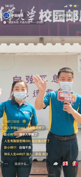 十大篇章、200多家全國優(yōu)秀青年組織,展示逢山開路、遇水架橋的開路先鋒精神。來自北京郵政的優(yōu)秀青年代表、中國郵政集團(tuán)有限公司清華大學(xué)郵政支局康智,出現(xiàn)在第四篇章《堅守匠心》?!皬?qiáng)國有我,開路先鋒” 交通運(yùn)輸部“強(qiáng)國有我 開路先鋒 慶祝建團(tuán) 100 周年交通大聯(lián)播活動” 受到網(wǎng)友熱情關(guān)注,400萬網(wǎng)友觀看了聯(lián)播活動。主播李敏和清華大學(xué)郵政支局營業(yè)部經(jīng)理康智共同出鏡。