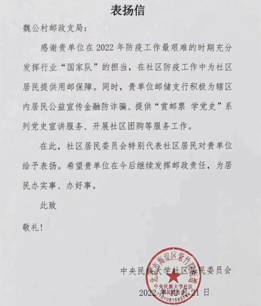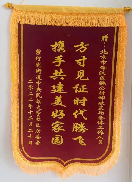 去年,魏公村郵政支局和中央民族大學(xué)支行積極助力民大社區(qū)建設(shè)各項(xiàng)工作,與社區(qū)聯(lián)合開展了“賞郵票 學(xué)黨史”系列宣講、線上社區(qū)團(tuán)購、愛老助老等豐富多彩的活動。尤其是特殊時(shí)期,魏公村郵政支局的工作人員逆行而上、堅(jiān)守崗位,以實(shí)際行動全力以赴服務(wù)社區(qū)保供保通保暢,得到社區(qū)居民的一致肯定和社區(qū)工作人員的高度認(rèn)可。為表達(dá)感謝之情,新年伊始,中央民族大學(xué)社區(qū)居民委員會主任及工作人員專門為魏公村郵政支局送來了錦旗和表揚(yáng)信,錦旗內(nèi)容為“方寸見證時(shí)代騰飛,攜手共建美好家園”,意為社區(qū)與郵政攜手奮進(jìn),共同為民服務(wù)、踐行使命。