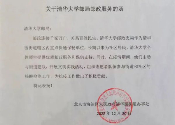 為此,清華園街道特發(fā)來表揚(yáng)函,函中寫道,郵政連接千家萬戶,關(guān)系百姓民生,清華大學(xué)郵政支局作為清華園街道轄區(qū)內(nèi)重點(diǎn)保通保暢單位,長期以來為社區(qū)居民、清華大學(xué)全體師生提供優(yōu)質(zhì)郵政服務(wù)和保供支持;同時(shí),疫情期間主動與街道建聯(lián),組織志愿者參與街道和社區(qū)核酸檢測工作,為抗疫工作作出積極貢獻(xiàn)。