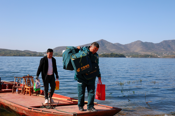 仲冬時節(jié),石新國投遞沿線的丹江庫區(qū)風(fēng)光旖旎,美不勝收,一艘載著十幾件包裹的快遞小船駛過,驚起幾只水鳥,水面泛起陣陣漣漪。然而,石新國緊緊懷抱郵包,目光堅(jiān)定而溫和,無心觀賞周圍美景。對于日復(fù)一日、年復(fù)一年行走在這里的他來說,及時準(zhǔn)確地把每封信、每張報紙和每件捎帶的東西送到鄉(xiāng)親們手里比啥都重要。