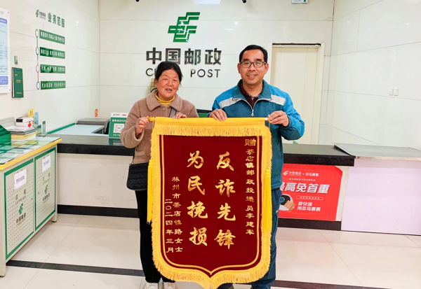 3月11日,家住林州市茶店鎮(zhèn)路家莊村的路大姐來到茶店郵政支局,專程為鄉(xiāng)郵員李建軍送去了錦旗,并向識破騙局,幫她避免財產(chǎn)損失的李建軍表示誠摯的謝意。鮮紅的錦旗上,“反詐先鋒 為民挽損”八個金燦燦的大字分外顯眼。